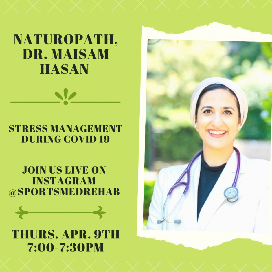 Feeling stressed out? Let’s connect! Our Naturopath, DR. MAISAM HASAN, will be hosting a LIVE INSTAGRAM discussion on “Stress Management during Covid 19” on Thurs, April 9th from 7:00-7:30pm.